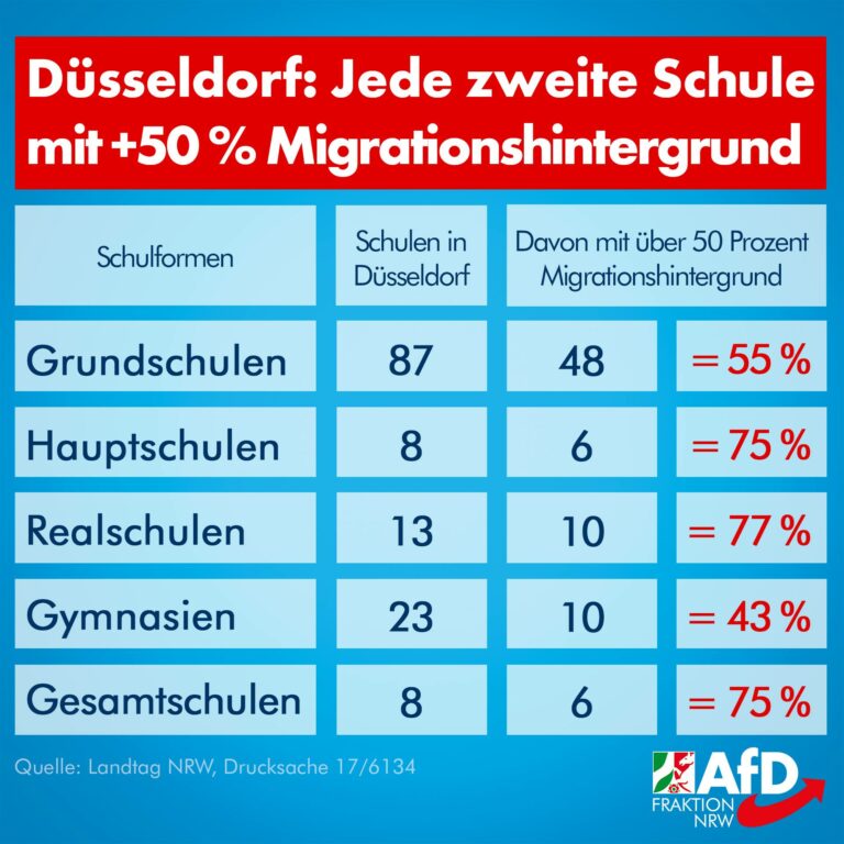 Nach AfD-Anfrage wird bekannt: An 80 von 139 Schulen in Düsseldorf haben mehr als 50 % der Schüler einen Migrationshintergrund. Neben den reinen Zahlen liefert