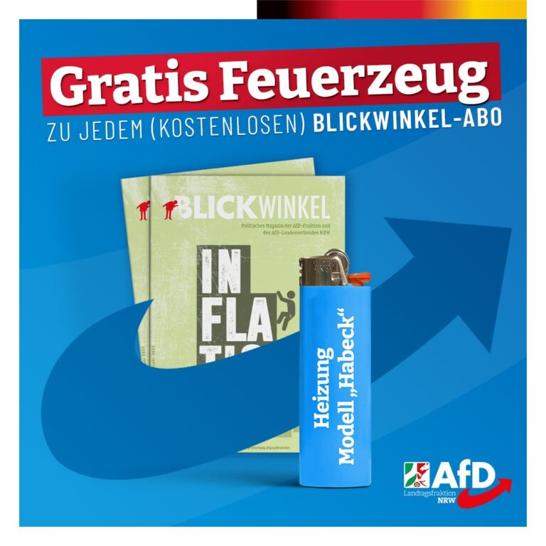 🔥 Gratis Feuerzeug „Heizung Modell Habeck“ zu jedem kostenlosen Blickwinkel Abo – dem Magazin der AfD-Fraktion NRW und des AfD-Landesverbandes NRW!