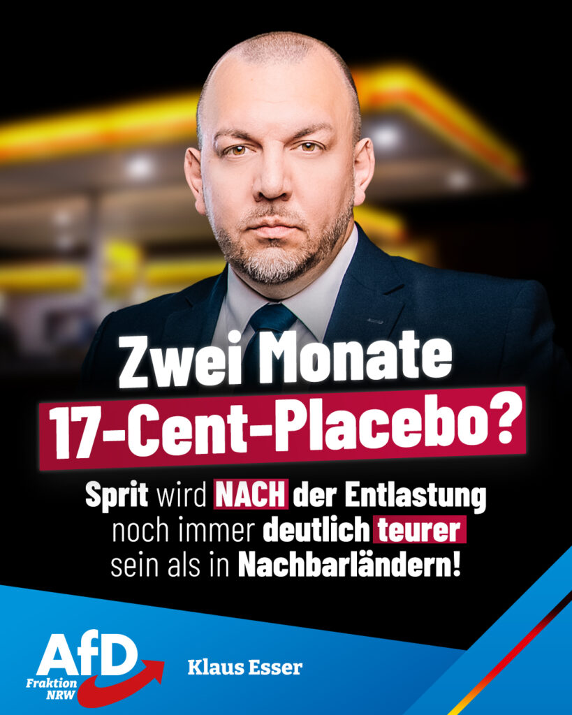 Nach wochenlangem Hin und Her plant die Bundesregierung nun doch eine Steuerabsenkung auf Benzin und Diesel. Hintergrund sind weiterhin exorbitant hohe Spritpreise. Dazu Klaus Esser, verkehrspolitischer Sprecher der AfD-Fraktion NRW: