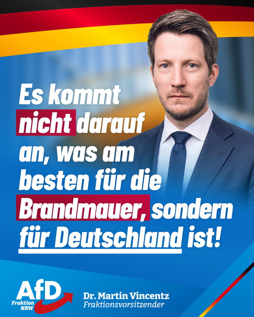 Immer wieder schwören sich die etablierten Fraktionen gegenseitig auf ihre antidemokratische Brandmauer ein, um die in Deutschland erfolgreichste Opposition an politischer Mitgestaltung zu hindern. Der daraus resultierende andauernde Stillstand lähmt unser Land. Er beraubt die Bürger einer guten und lebenswerten Zukunft, kritisiert Dr. Martin Vincentz, Vorsitzender der AfD-Fraktion NRW: