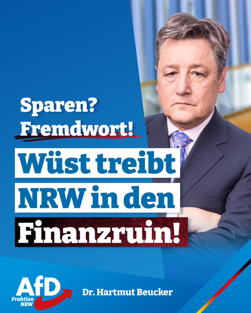„Die Landesregierung kann nur durch die Aufnahme exorbitanter Schulden ihren Haushalt aufstellen“, warnt Dr. Hartmut Beucker, haushalts- und finanzpolitischer Sprecher der AfD-Landtagsfraktion NRW. „Für diese schwarz-grüne Landesregierung ist das Wort ‚Sparen‘ genauso ein Fremdwort wie für die Koalition im Bund mit dem SPD-Finanzminister Lars Klingbeil.