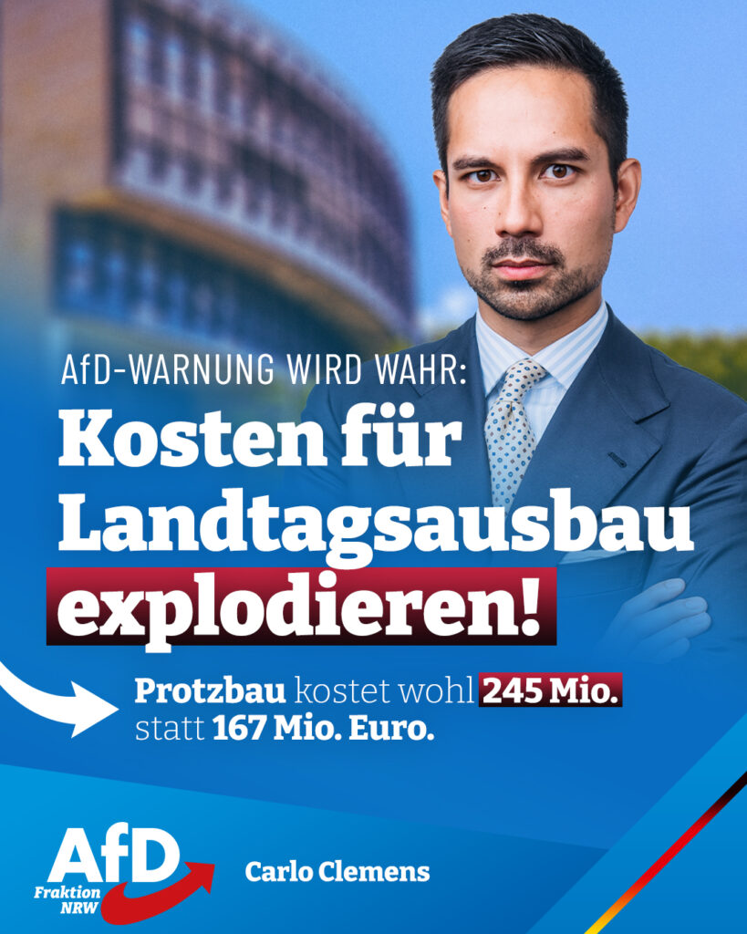 Scharfe Kritik an mangelnder Kostentransparenz und Verschwendung äußert ebenso der Bund der Steuerzahler NRW (BdSt). Dieser fordert unter anderem eine Wahlrechtsreform, um das weitere Anwachsen unseres Landesparlaments zu begrenzen. Die „überraschende“ Kostenexplosion kommentiert Carlo Clemens, bau- und wohnungspolitischer Sprecher der AfD-Fraktion NRW:
