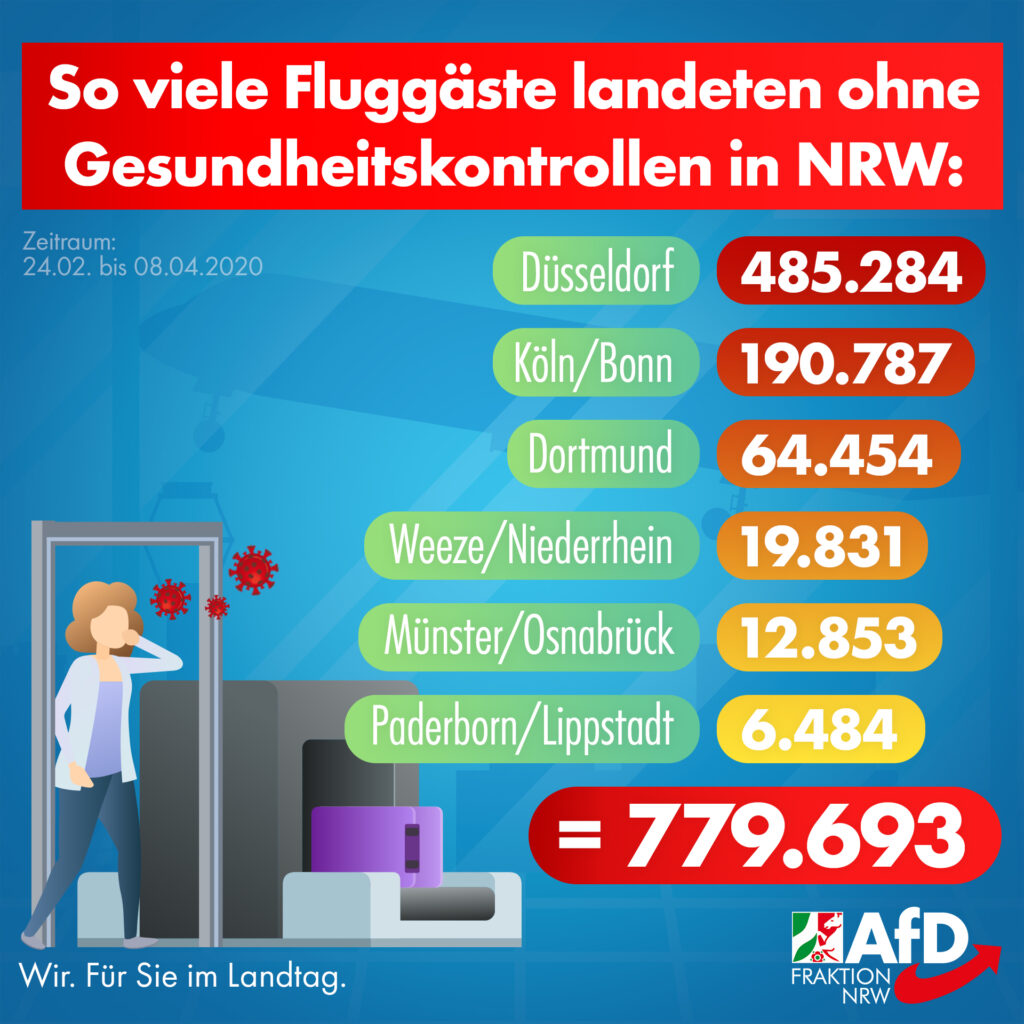 Die einzigen sogenannten Sicherheitsmaßnahmen seien mehrsprachige Informationen „durch öffentlich ausgehängte Poster“ in den Flughäfen gewesen! Das gibt das NRW-Gesundheitsministerium auf Nachfrage mehrerer Abgeordneter der AfD-Fraktion NRW zu. Räumt die Behörde auch ein, der Weiterverbreitung des Coronavirus dadurch Vorschub geleistet zu haben?