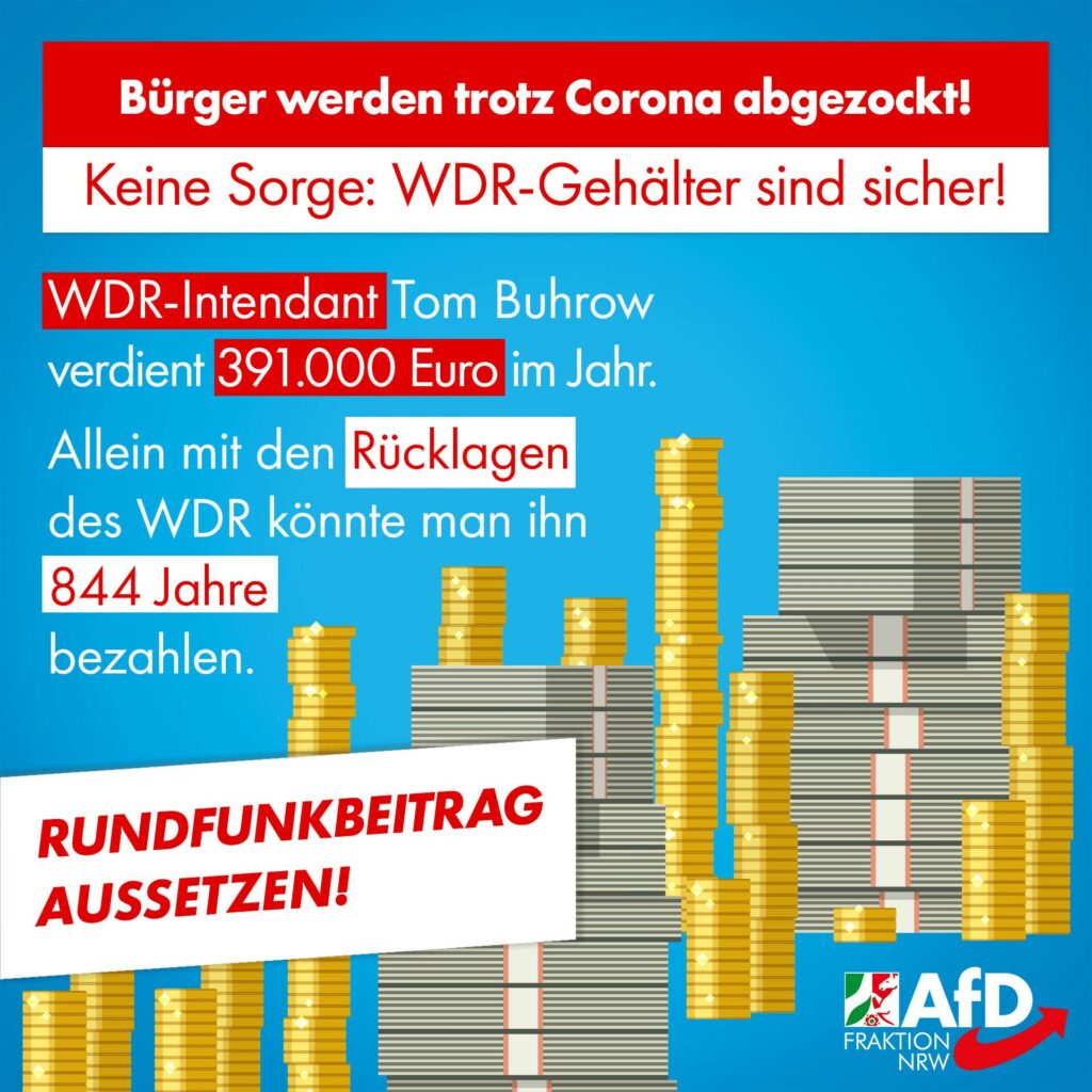 Eine Debatte darüber, das Abkassiersystem zugunsten der krisenbeutelten Bürger mal für einige Monate auszusetzen, gibt es bislang nicht. Dabei sollen die ARD-Rundfunksender über Rücklagen in Höhe von 1,1 Milliarden Euro verfügen! 330 Millionen Euro davon entfielen auf den WDR – das entspricht 844 mal Buhrows Jahresgehalt. Zum Vergleich: