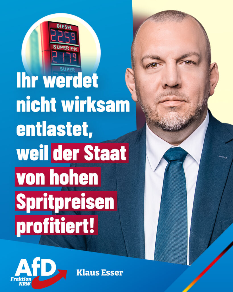 Der Benzinpreis könnte sofort deutlich sinken, doch es mangelt am politischen Willen. Für eine Regierung, die in Wahrheit gar nicht sparen will, sondern immer mehr Geld für Klimaideologie (18/3847), illegale Migration, NGOs oder im Ausland verteilt, bleibt der Autofahrer eine hochwillkommene Einnahmequelle. Dazu Klaus Esser, verkehrspolitischer Sprecher der AfD-Fraktion NRW: