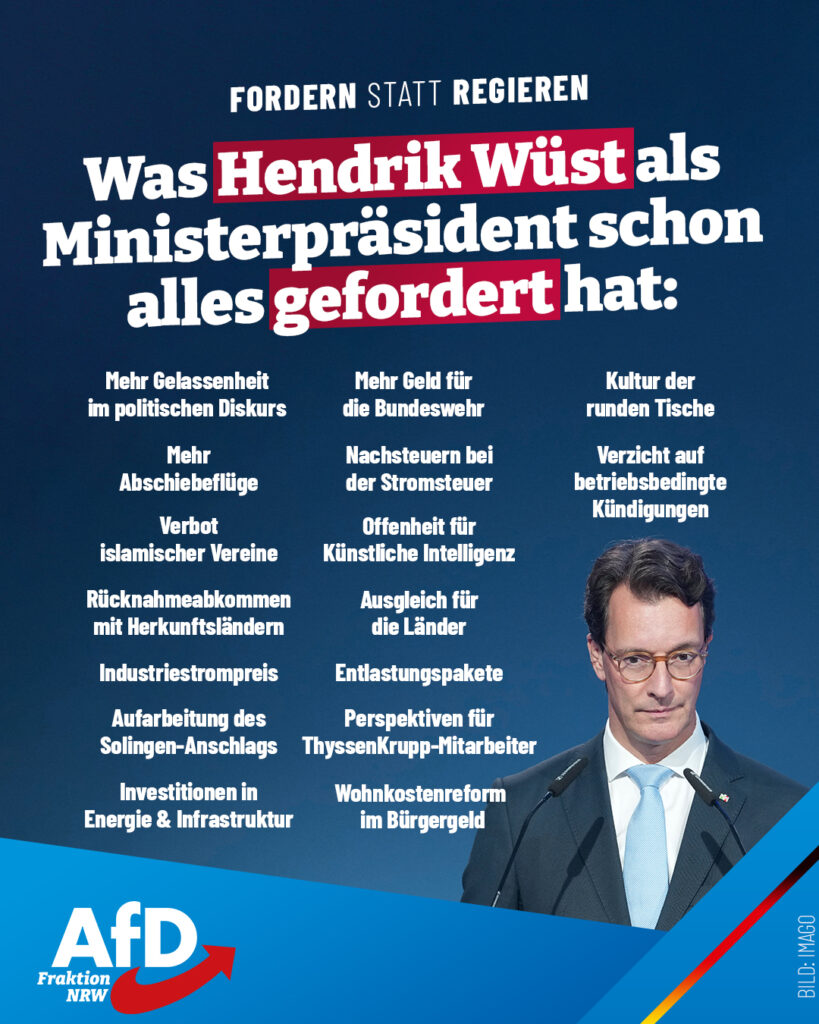 Ministerpräsident Hendrik Wüst (CDU) blickt mittlerweile auf eine beachtliche Liste eigener politischer Forderungen zurück, welche selbst die Anzahl gebrochener Versprechen seines Parteikollegen und Bundeskanzlers Friedrich Merz weit in den Schatten stellt. Dazu Dr. Martin Vincentz, Vorsitzender der AfD-Fraktion im Landtag NRW: